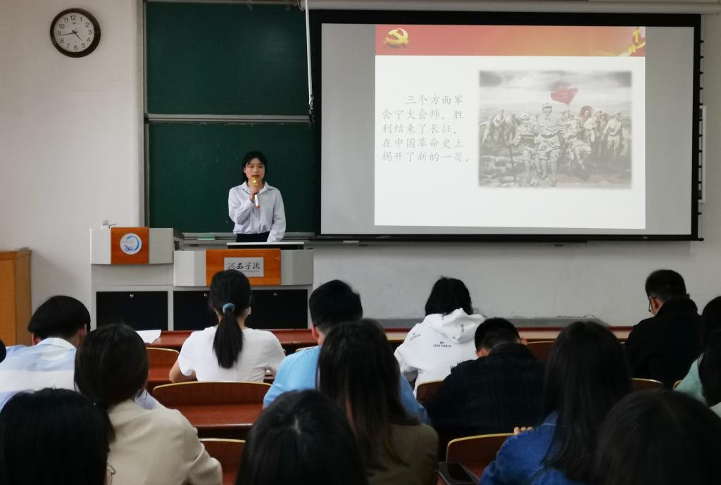 活动中,学生党员讲述了《红五军血染大墩梁》和《长征》,带领大家缅怀先烈、抚今追昔,感悟“大墩梁上埋忠骨,烈士英名颂千秋”的英雄情怀,同时也引领大家学习革命先辈们在长征途中攻克难关的决心,领悟长征精神为中国革命不断从胜利走向胜利提供了强大精神动力。入党积极分子分享了《黄显声虎入笼中威不倒》和《长津湖冰雕连的故事》,弘扬了黄显声“虎入笼中威不倒,浩然正气贯长虹”的英雄气概和冰雕连英勇顽强、不怕牺牲的革命精神。