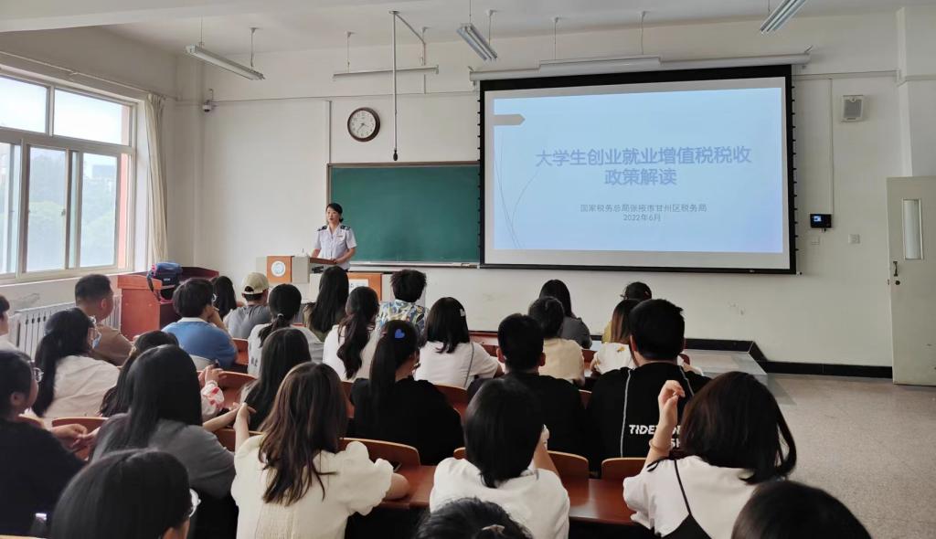 68日下午,为进一步落实校地合作、服务地方经济社会发展的务实举措,根据国家税务总局《2022年助力小微市场主体发展“春雨润苗”专项行动方案》,经济管理学院与甘州区税务局、甘州区工商联开展支持大学生创业税费服务系列活动。甘州区税务局、甘州区工商业联合会负责人、经济管理学院师生100多人参加活动。