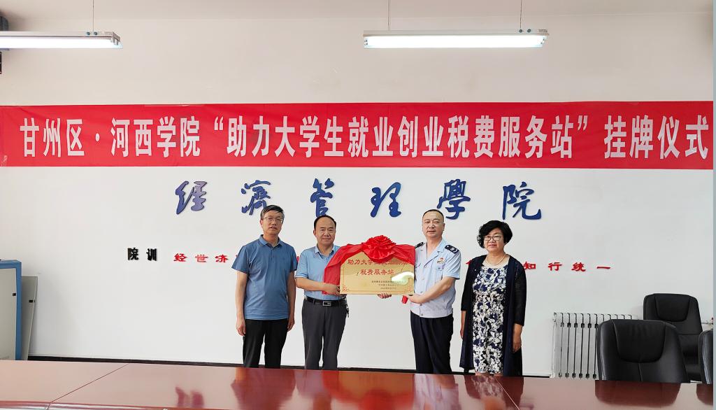 甘州区税务局、甘州区工商业联合会与经济管理学院负责人举行了座谈会,负责人介绍了2022年“春雨润苗”行动落实各项新的组合式税费支持政策。对下一步深度开展校地合作达成了意向。并为“助力大学生就业创业税费服务站”揭牌。