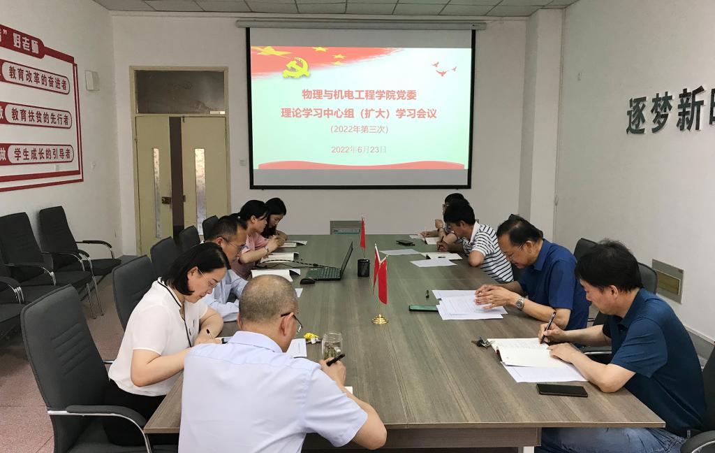6月23日下午,物理与机电工程学院召开党委理论学习中心组(扩大)学习会。会议由学院党委负责人主持,中心组成员及各党支部书记参加了学习会。