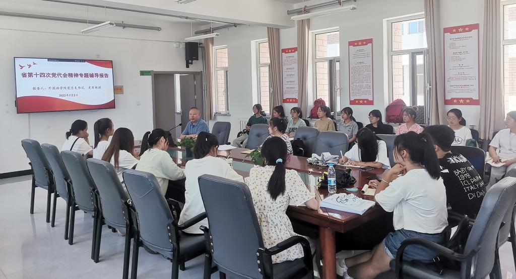 为进一步贯彻落实省第十四次党代会精神学习工作安排,7月6日下午,外国语学院党总支负责人为学生党员、入党积极分子作省第十四次党代会精神宣讲报告。