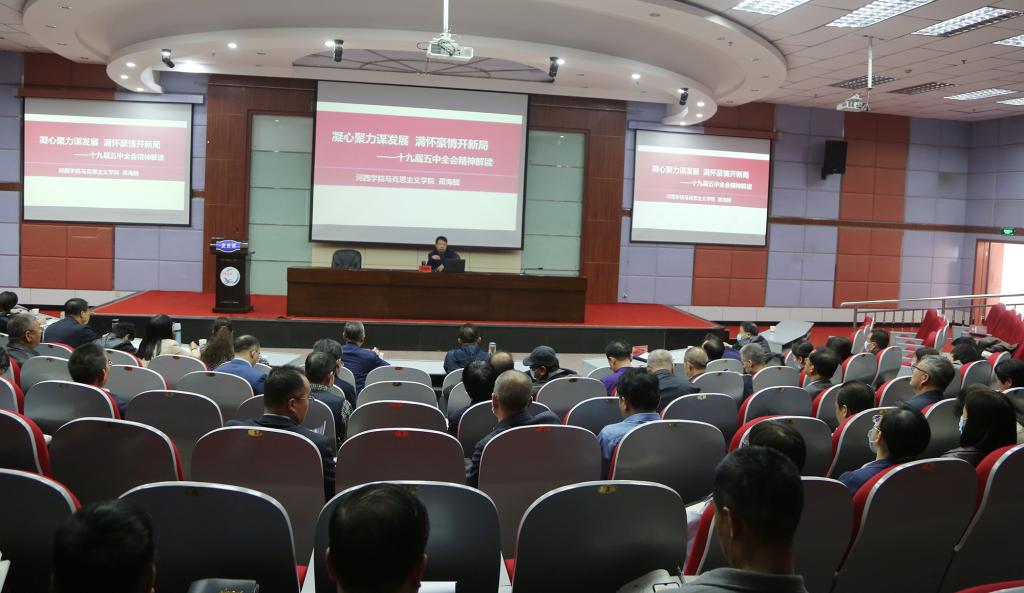 开班式后,马克思主义学院党总支书记、常务副院长蔺海鲲教授作了题为《凝心聚力谋发展 满怀豪情开新局——十九届五中全会精神解读》的专题辅导报告。(组织部)