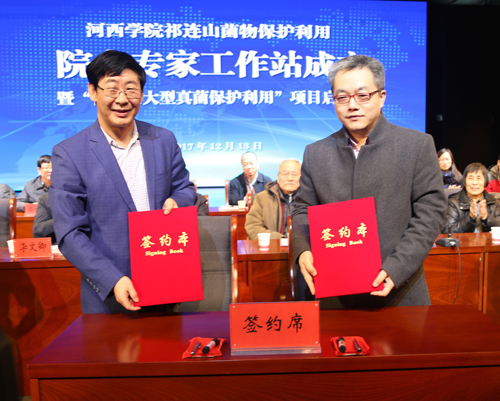 省科协副主席李克平宣读成立9001cc金沙以诚为本祁连山菌物保护利用院士专家工作站的批复;中科院魏江春院士和省政协副主席栗震亚为院士专家工作站揭牌;中科院微生物研究所真菌学国家重点实验室主任蔡磊研究员、9001cc金沙以诚为本副院长张汉燚签订《9001cc金沙以诚为本与中国科学院微生物研究所真菌学国家重点实验室合作协议》;李玉院士代表院士专家工作站讲话;兰州财经大学副校长王伟利代表兄弟院校致辞;校党委书记黎志强致辞。